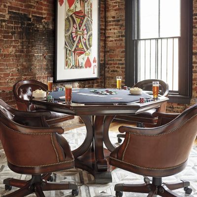 Edison Game Table and Chairs | Frontgate from akamai-scene7.frontgate.com What type of chair can enhance your poker play? Table can easily fit 10 players, solid hardwood construction, stainless steel cup holders, padded/cushion rim cover by water resistant black vinyl, steel reinforced frame and folding legs, table comes fully assembled. Shop professional poker tables and chairs! Most relevant best selling latest uploads. There's nothing worse than sitting for hours on uncomfortable chairs or benches, so investing in party chairs will give your guests the comfort they deserve, and. Choose from different woods and leathers for your custom poker table set made in the usa. Our game tables and chairs are an excellent addition to your game room or as a stand alone piece in any room. In the last case, consider a flip top poker table with chairs that can double as a dining table as well.